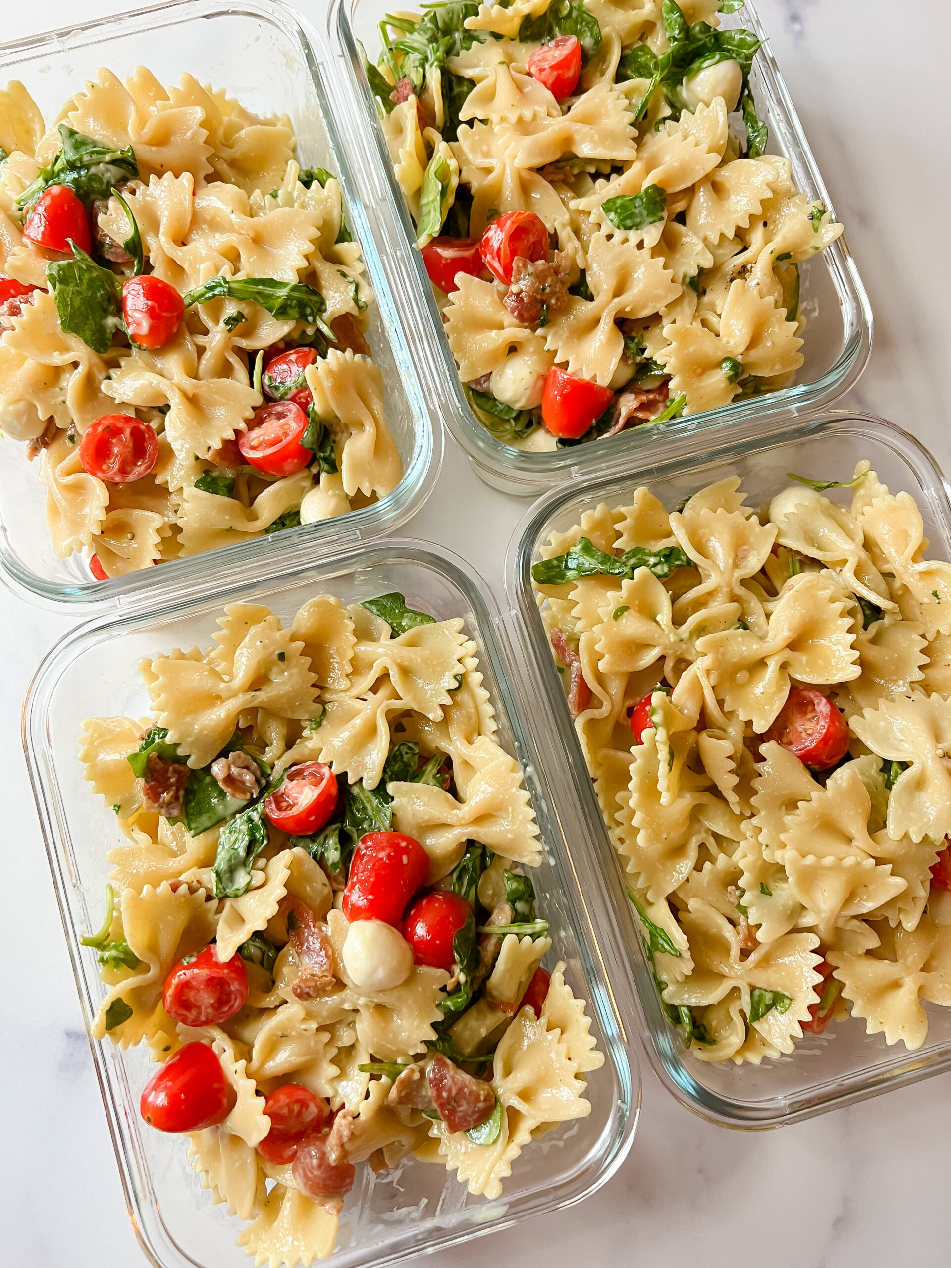 - Combine noodles, bacon, mozzarella balls, arugula, and cherry tomatoes