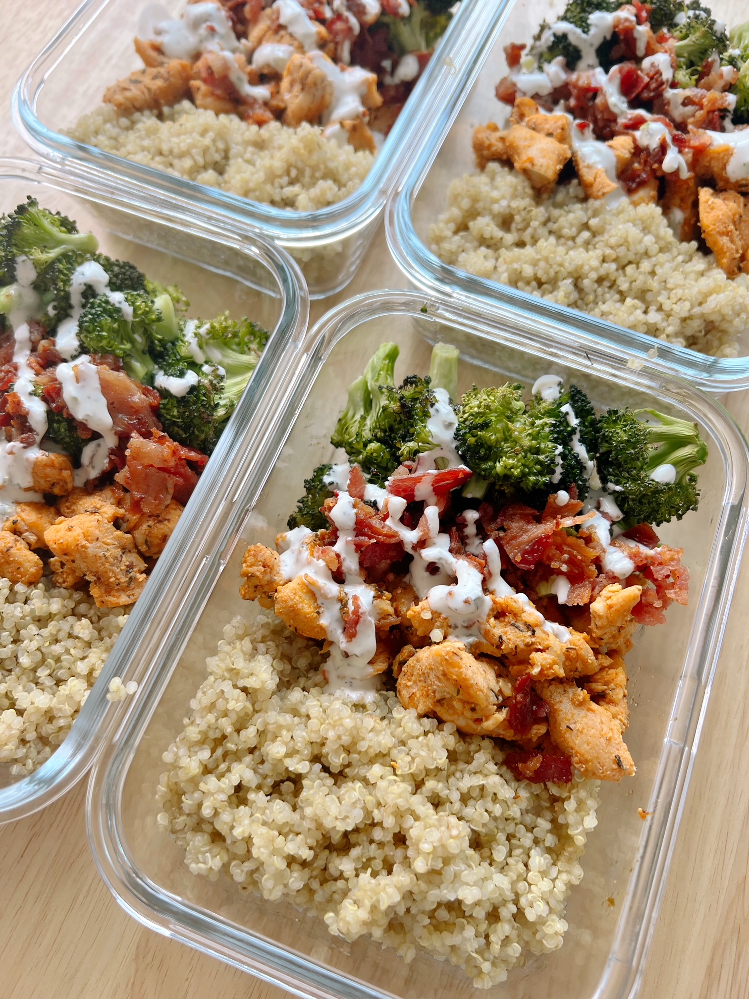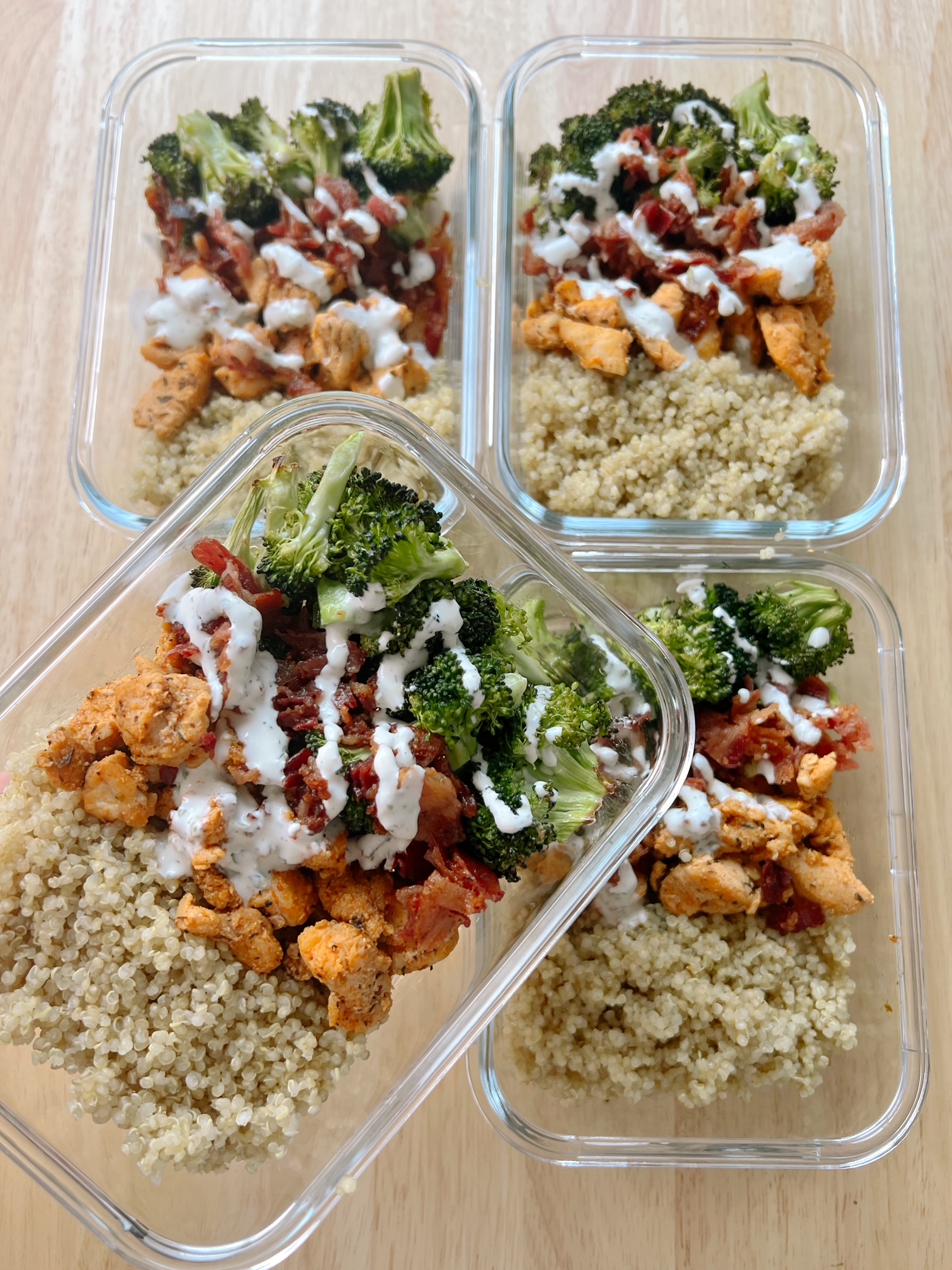- Drizzle ranch dressing over the chicken, bacon, and quinoa in each container. Alternatively, you can add a small dressing container with ranch dressing to add on the day of consumption.