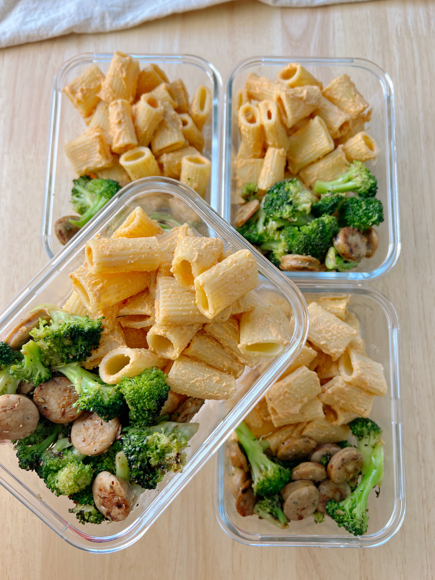 - Assemble Meal Prep Containers: Divide the sautéed broccoli and chicken sausages into four meal prep containers. Add a generous serving of the vodka pasta on top of each container.