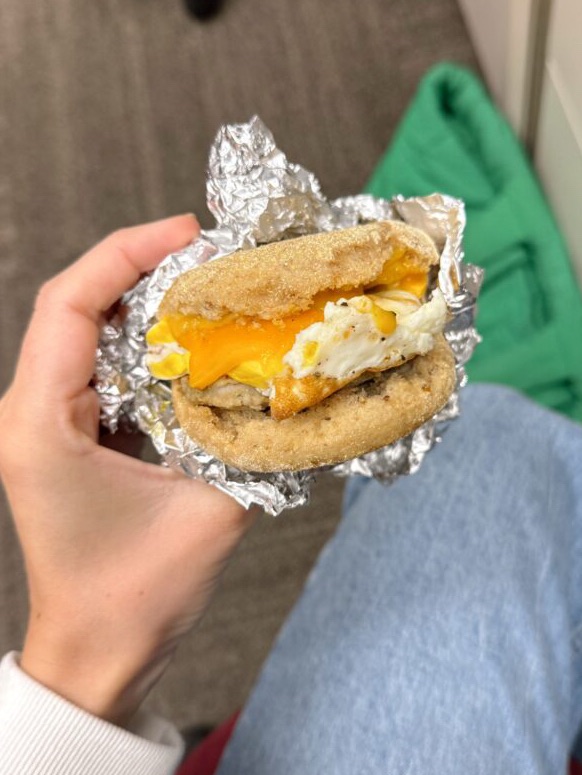 - Layer sausage, egg, and half a cheese slice on each muffin; top and press gently.