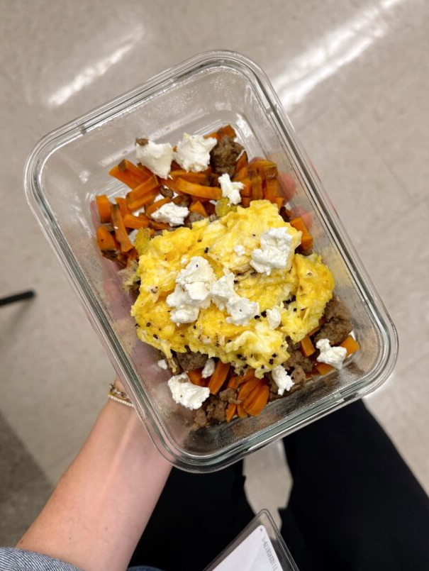 - Divide sweet potatoes, sausage, and eggs into 4 containers. Cool, then refrigerate.