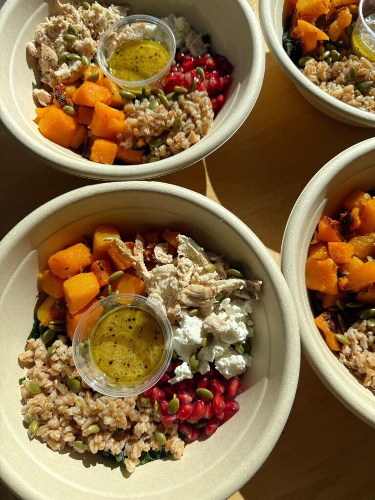- Divide kale into 4 containers; top with squash, chicken, pomegranate, goat cheese, and pepitas.
