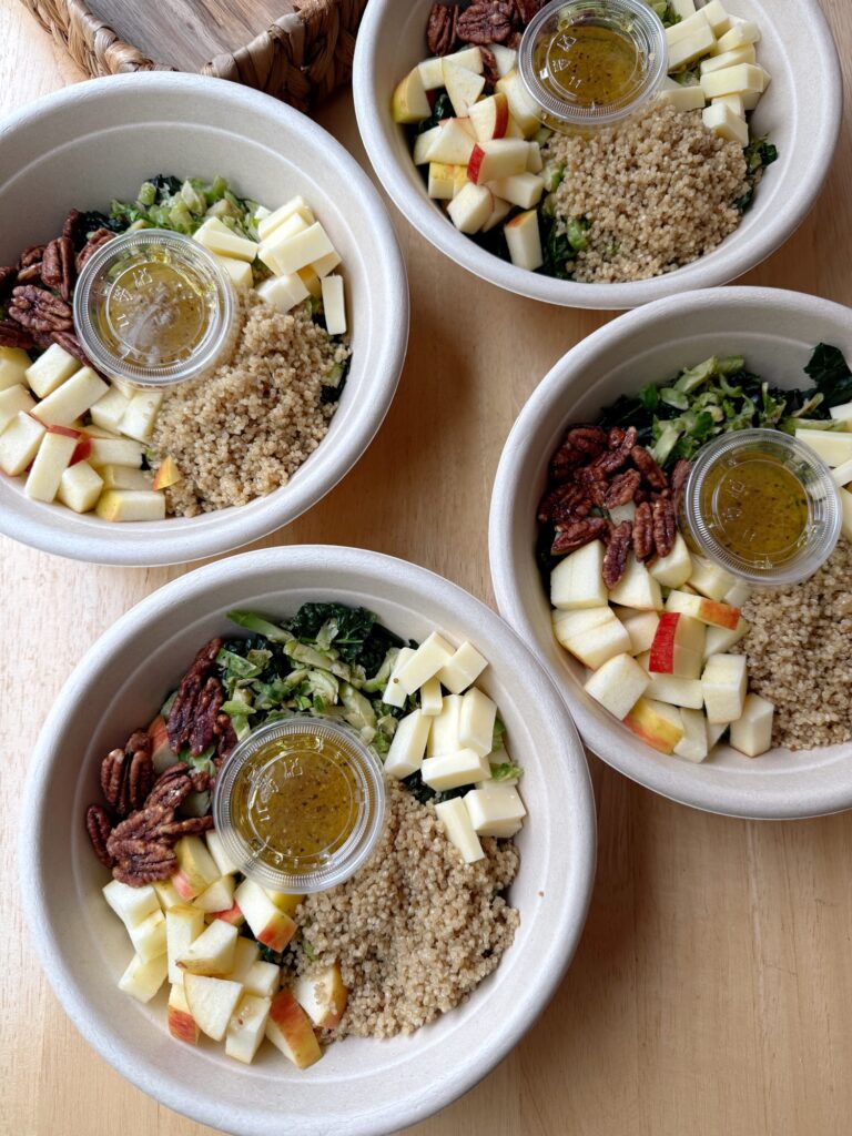 - Divide kale and Brussels into 4 containers, then top with quinoa, apple, pecans, and cheddar.