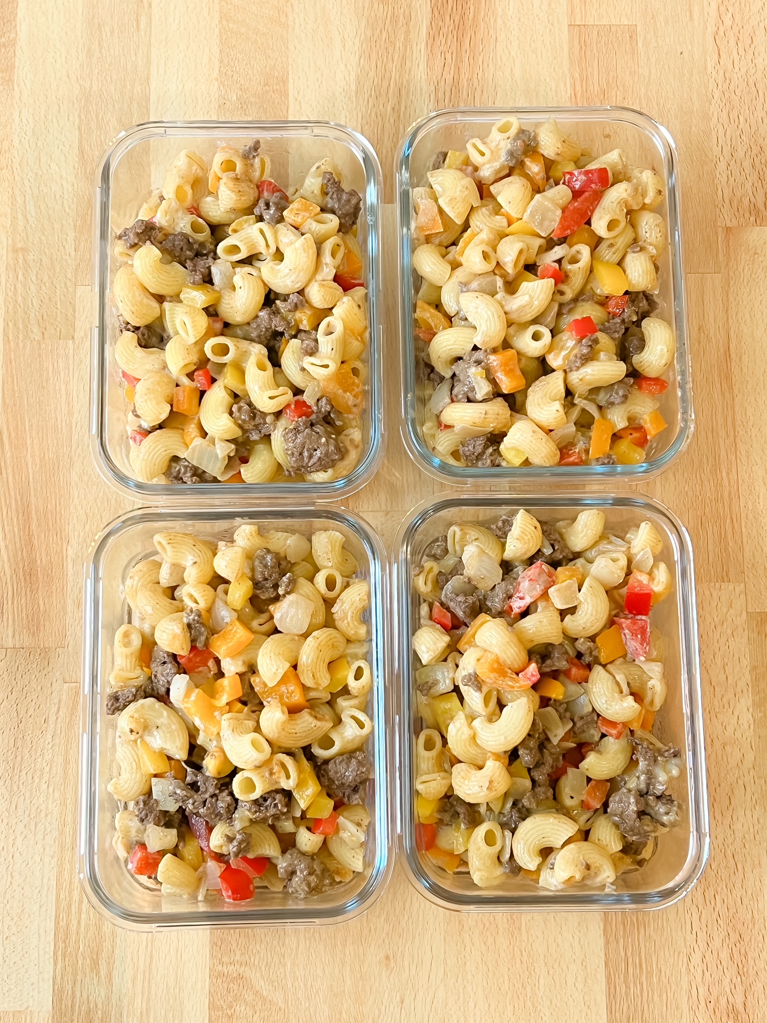 - Divide the Taco Pasta Meal Prep into four meal prep containers, ensuring each portion has a balance of pasta, meat, and veggies.
