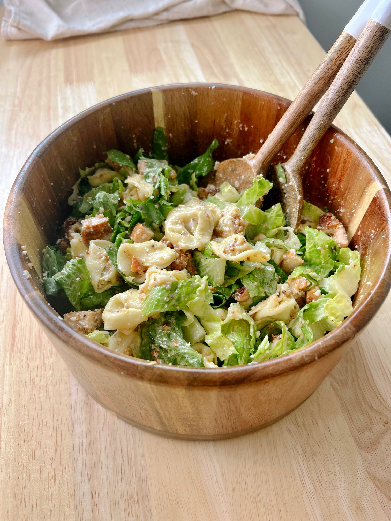 - In a large bowl, combine the cooled tortellini, cooked chicken, shredded Parmesan, sautéed bread crumbs, Romaine lettuce, and Caesar dressing.